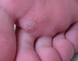 ドーム状の水疱のようなできものです。口唇と手や足のゆびの爪の根元近くに出来ます。